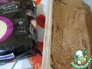 Форму для выпечки смазать сливочным маслом. Присыпать мукой. Стряхнуть лишнюю муку. Выложить первый слой - шоколадный.