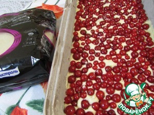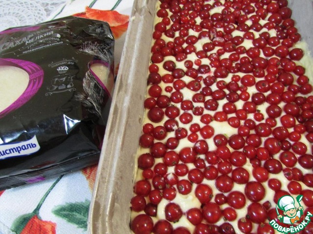 • На белый слой выложить смородину, слегка вдавливая ее в тесто.