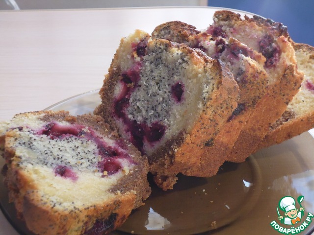 Восхитительно!!! Муж за пол минуты слопал большой кусок кекса!! А на мой вопрос: "Как тебе кекс?", переспросил: "Кекс? Какой кекс?" Не было, говорит, никакого кекса!! В общем, буду готовить теперь такой кекс с огромным удовольствием! Готовила в кексовой форме. У меня с замороженной брусникой. Ягода во время выпечки немного вытекала и пригорала.. Сверху тоже немного Маковый слой припекся черезчур, как бы я не прикрывала его фольгой.. Готовила час, до сухой лучины. Середина пропекалась дольше всего. В следующий раз попробую использовать форму побольше размером и не высокую, так как кекс поднялся очень!! Корочка получилась хрустящей, а мякиш кекса нежный!!