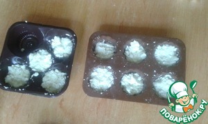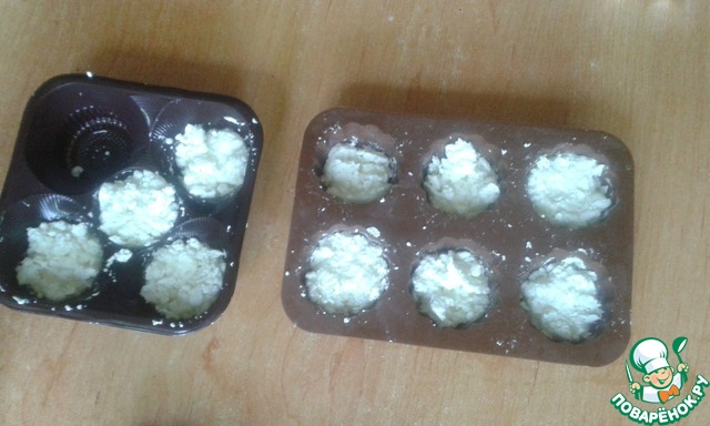 Творог разделить на 10 равных частей, положить с силиконовые формочки и отправить в морозилку