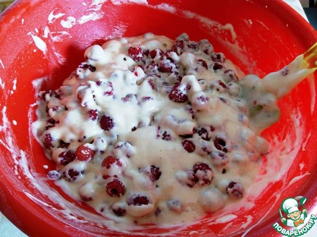 4 яйца комнатной температуры взбиваем со 180 гр сахара 10 минут. Сахар добавляем постепенно по чайной ложке. Добавляем в конце взбивания пакетик ванилина и чайную ложку разрыхлителя. 180 гр муки вмешиваем силиконовой лопаткой потихоньку сверху вниз. Перемешиваем в этой же посуде 4 стакана малины осторожно, чтобы все ягоды обволоклись тестом.