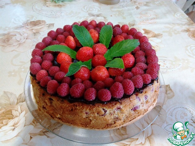 Украшаем ягодами малины, клубники и листиками мяты. Это была моя первая шарлотка. Пришли соседи по даче - принесли угощение, вкусный плов. Я угостила их своей шарлоткой.