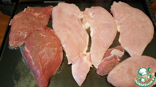 Т. к. жарка такого разного мяса требует довольно много времени, я решила пожарить мясо в эл. гриле - это быстро и удобно.