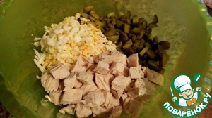 Филе индейки и яйца отварить. Маринованные огурцы и филе порезать кусочками, яйца натереть на тёрке