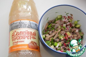 Смешайте все ингредиенты и залейте холодным квасом "Семейный секрет". Соль и сметану добавьте по вкусу.