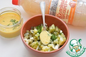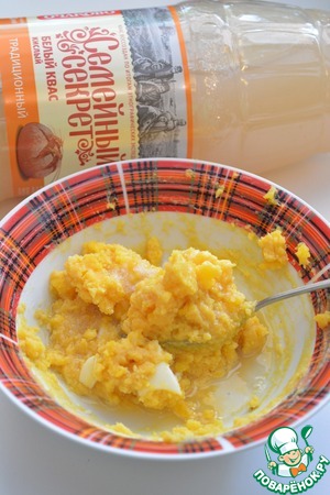 Растирайте желтки с горчицей, подливая по ложке кваса и рассола, пока масса не станет похожа на соус.