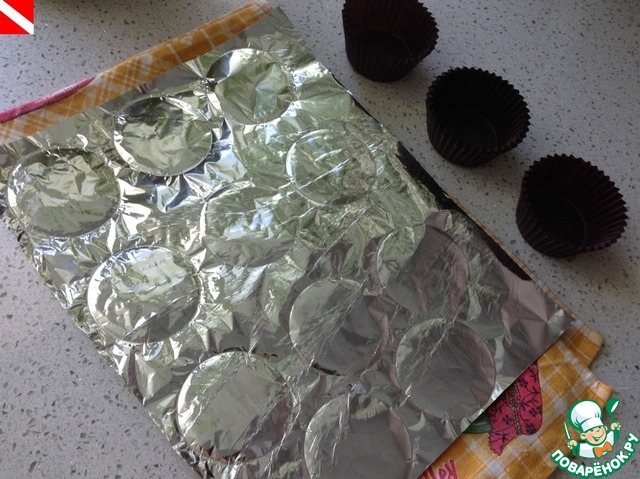 Сначала я приготовила украшения - фольгу положила на полотенце и стаканом подходящего диаметра наметила круги.