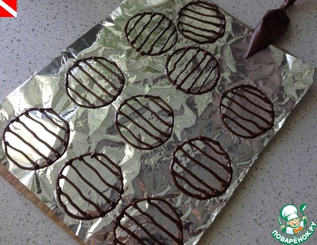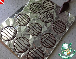 Шоколад растопила и нарисовала вот такие "решеточки-гриль". Т. к. шоколада растопила много, то позже сделала еще поперечные решеточки. Убрала в прохладное место.