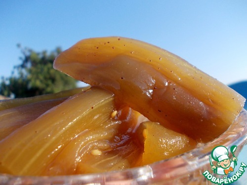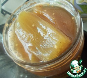 Оставшийся сахар смешать со стаканом воды, добавить мед и специи, выжть сок лимонов. Вылить все это в баклажаны и проварить 20-25 минут.