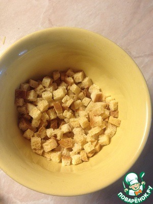 Итак, для начала ломтики батона нарезаем мелкими кубиками и поджариваем в духовке до румяного цвета. Я это делала на 150 градусах.