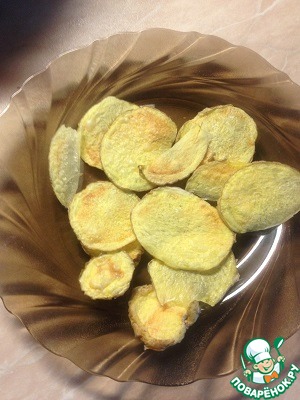 Затем нарезаем картофелину кружочками как можно тоньше. В идеале кружочки должны быть не толще 1 мм. Выкладываем кружочки в один слой на тарелку, смазанную растительным маслом и ставим в микроволновую печь. Время приготовления зависит от мощности вашей микроволновки. У меня обычно уходит минут 6. Кружочки должны подсохнуть, зарумяниться и начать хрустеть как настоящие чипсы. Готовые чипсы достаем, снимаем с тарелки и даем им остыть.