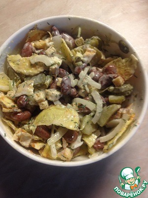 В миску высыпаем фасоль, добавляем порезанные кружочками огурчики и тонко порезанный четвертинками лук, мелко порубленный укроп. Все хорошо перемешиваем. Перед подачей на стол добавляем в салат сухарики и произвольно поломанные чипсы, заправляем майонезом.