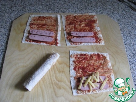 • Разрезаем сосиску вдоль, раскладываем на листы лаваша заворачиваем.