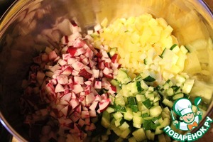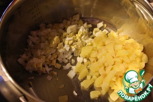 Картофель и яйца отварить, остудить и нарезать мелкими кубиками.