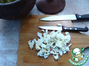 Яйцо сварили вкрутую. Рубим его тоже мелко.
