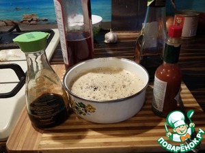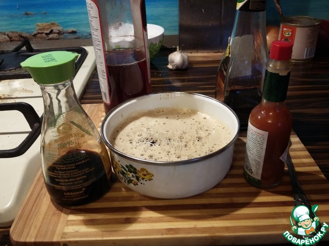 Вливаем уксус, соевый соус, табаско, соль и все тщательно перемешиваем. -