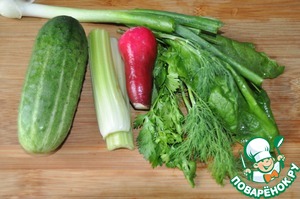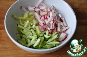 Овощи (огурец, редис, сельдерей) режем кубиками или соломкой. Можете натереть на крупной тёрке.