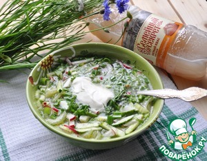 Я предпочитаю класть овощи с зеленью в тарелку и там уже заливать ледяным квасом. В данном случае идеально подходит квас "Семейный секрет" традиционный ТМ "Очаково". Сверху кладём ложку сметаны или йогурта.