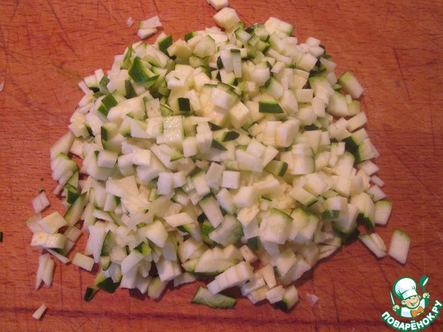 Цукини почистить. порезать мелкими кубиками. Я не чистила и, возможно, поэтому кусочки показались мне немного жестковатыми. В следующий раз, когда буду готовить, потру на терке.