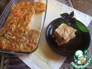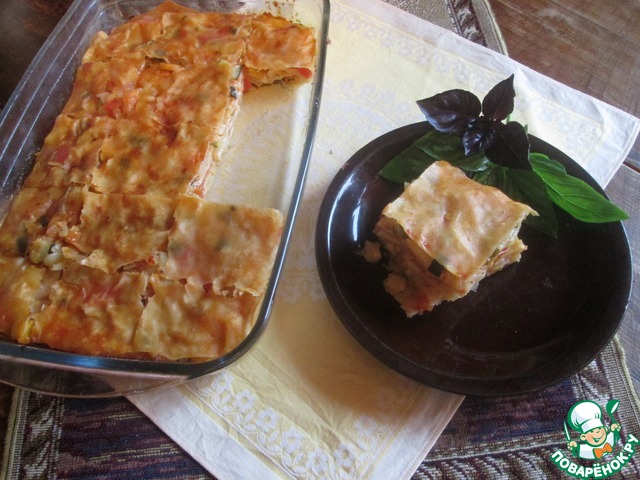 Разогреть духовку до 180 градусов. Тесто для лазаньи разделить на 4 части и раскатать по размеру формы. У меня прямоугольная, 26x16. Форму смазать растительным маслом, выложить лист теста, на него 1/3 овощей. Далее повторять слои, их получится три. Верхний лист теста смазать кетчупом или растительным маслом и выпекать лазанью примерно 30 минут.
