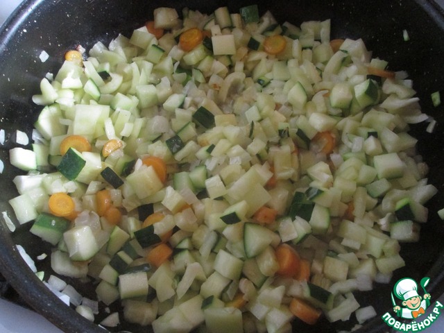 На сковороде разогреть растительное масло и обжарить на нем не крупно порезанные лук ( 1 шт. ), чеснок ( 1 зуб. ), цукини и перец в течении 10 минут. Посолить, поперчить.