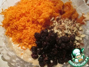 Морковь потереть на мелкой терке, изюм промыть и просушить. Курагу промыть, просушить и не крупно порезать. добавить цедру, порубить орехи и все это соединить с тестом. Вымешивать сильно не нужно - соединились ингредиенты и достаточно.