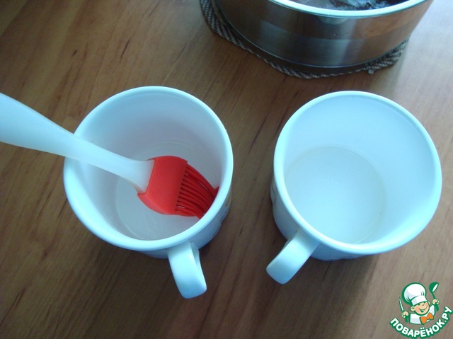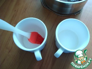 Поэтому я подмазала каждую кружку кисточкой с подсолнечным маслом, а потом из общей посуды выложила в них тесто. -