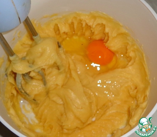 В теплое (негорячее!) тесто добавить яйца и взбить до однородности.