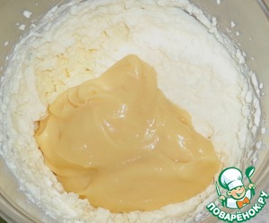 В муку налить молоко и перемешать. -