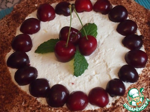 Уложить третий круг, смазать торт сверху и с боков кремом, немного крема оставить. Сверху выложить половинки черешен.