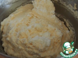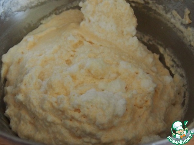 Желтки взбить с сахаром до светлой пены. Продолжая взбивать, постепенно добавлять подсолнечное масло без запаха и воду. В полученную массу добавить муку с разрыхлителем, размешать лопаткой. В несколько приемов добавить белки, осторожно перемешивая.