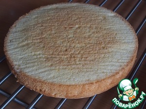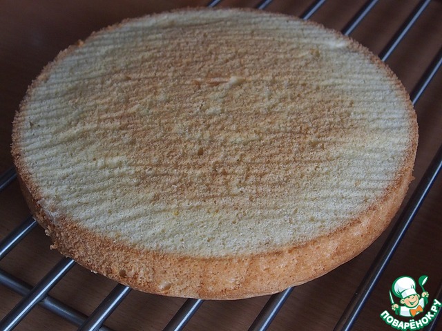 Дно формы застелить бумагой для выпечки, вылить тесто в форму и печь в разогретой духовке при температуре 180 градусов примерно 25 минут. Готовность проверять спичкой. Готовый бисквит оставить в форме на 10 минут, затем вынуть из формы и остудить.