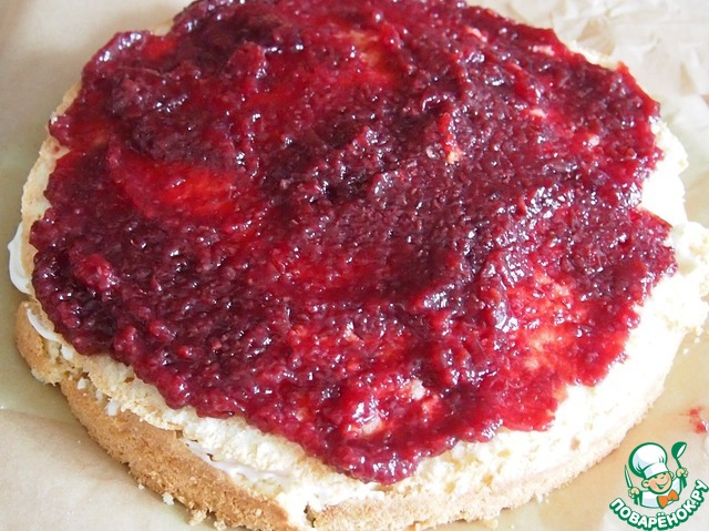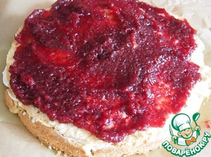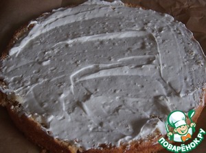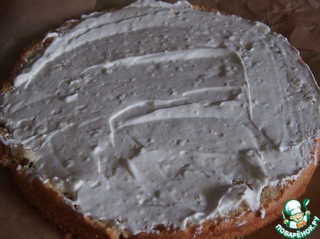 Приготовить крем: сливки взбить с ванильным сахаром, добавить маскарпоне, перемешать. Те, кто любит послаще, могут добавить сахарную пудру по вкусу. Корпус торта продольно разрезать на три круга. Первый круг положить на блюдо, нанести слой крема.