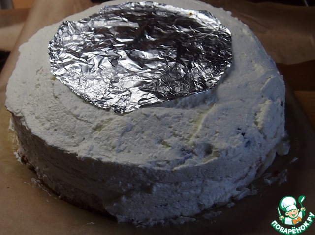 На черешню разложить остаток крема и украсить торт. Искусство украшения тортов, как это делают некоторые поварята, для меня недосягаемо, поэтому моя скромная фантазия изобрела следующее: я вырезала их фольги круг, поместила его посредине и посыпала торт какао-порошком, получился коричневый ободок.