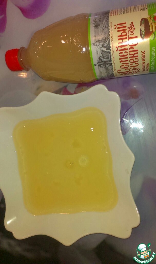 - Квас (примерно полстакана, жидкости и муку меряем одинаковой чашкой или стаканом. Квас белый,кислый "Очаково") — 0,125 л