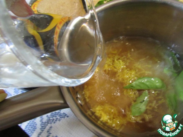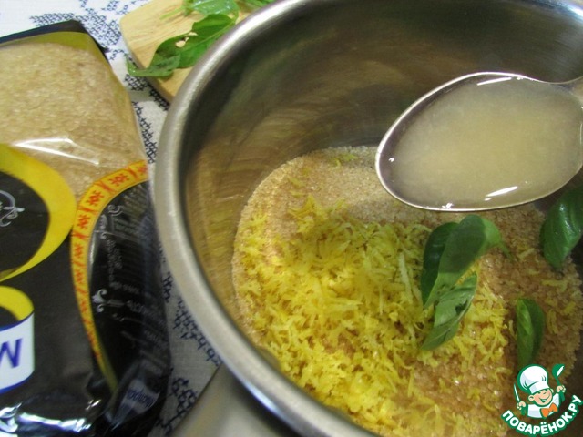 Сварить сироп. В сотейнике смешать сахар Мистраль Демерара тростниковый, несколько листиков базилика и лимонную цедру. Добавить половину лимонного сока.