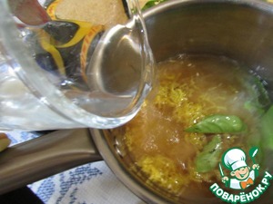Влить 200 мл минеральной воды без газа. Сотейник поставить на огонь. Довести до кипения. Кипятить 5 минут. Снять с огня. Дать полностью остыть.