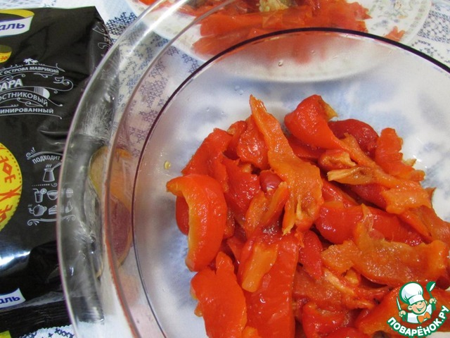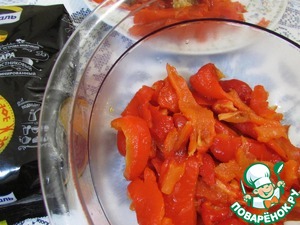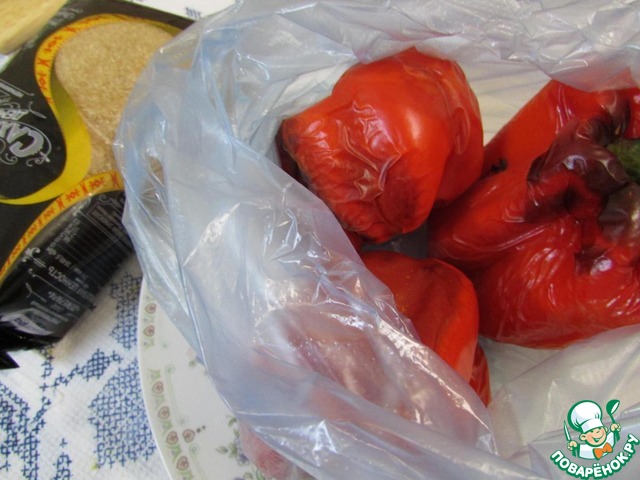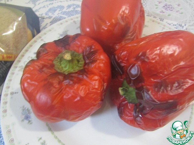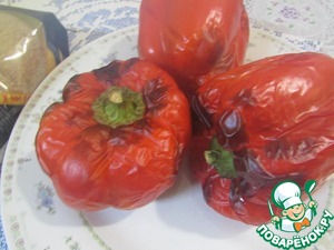 По истечении времени - над тарелкой, чтобы сохранить сок, который образовался в перцах во время запекания, с перцев снять кожицу, вынуть черенок с внутренностями.