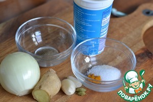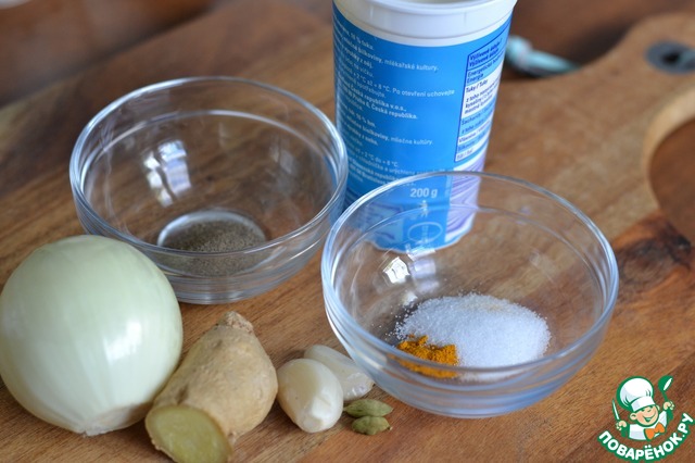 Лук, чеснок, имбирь, куркуму, йогурт, кардамон, соль размельчить на блендере.