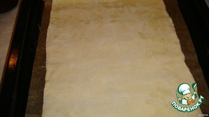 На противень застелить пекарскую бумагу и выложить на неё большую часть теста. -