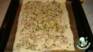 Курицу нарежьте на куски и обжарьте, посолите, в конце добавьте зелёный лук. Готовую курицу выложите на наш пласт.