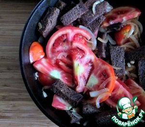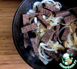 Затем мясо вынуть и в этой же сковороде обжарить две-три минуты лук. Добавить к луку хлеб, обжарить еще пару минут.