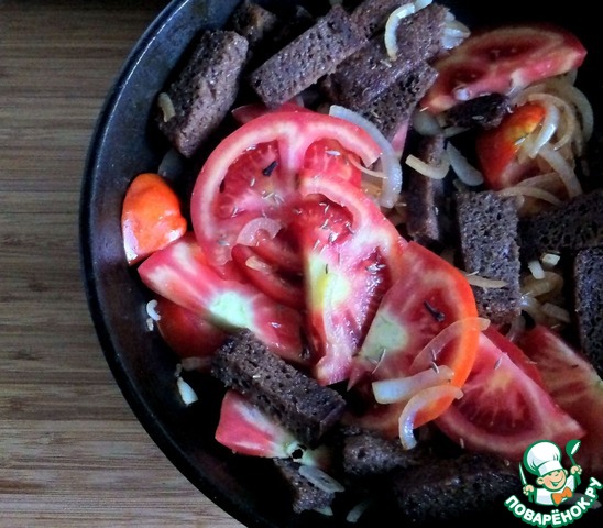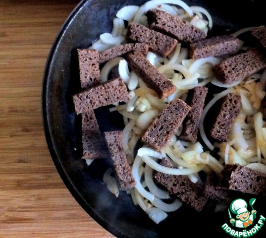 • Затем мясо вынуть и в этой же сковороде обжарить две-три минуты лук. Добавить к луку хлеб, обжарить еще пару минут.