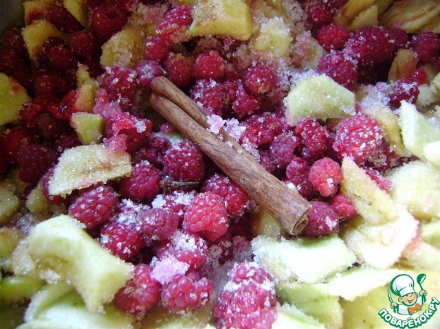• Яблоки добавляем к малине. Так же добавляем корицу и гвоздику. И оставляем от 20 минут до 1 часу, в зависимости от того каким временем Вы располагаете.