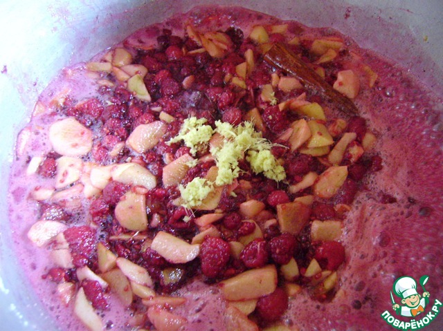 Яблоки добавляем к малине. Так же добавляем корицу и гвоздику. И оставляем от 20 минут до 1 часу, в зависимости от того каким временем Вы располагаете.