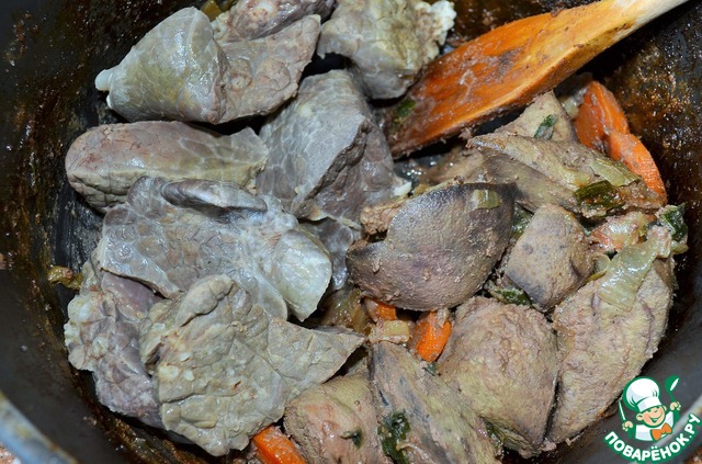 Накануне отварить говяжье легкое. Предварительно вымочить легкое в соленой воде 2 - 3 часа. Отварить до готовности, сменив воду после 10 минут кипения. В сковороде разогреть масло для начинки, обжарить лук и морковь, добавить куски печени и обжарить печень, помешивая 4 - 5 минут на среднем огне. НЕ СОЛИТЬ!