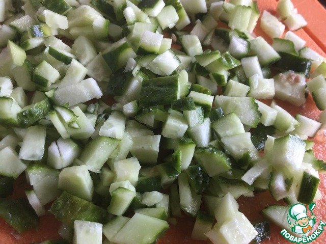 Теперь готовим окрошку: сначала отделите мясо цыплёнка от кожи и костей, мелко нарежьте. Для окрошки я взяла половину приготовленного цыплёнка.