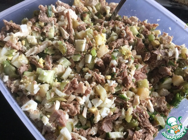 Молодой картофель хорошо помойте, отварите, мелко нарежьте.