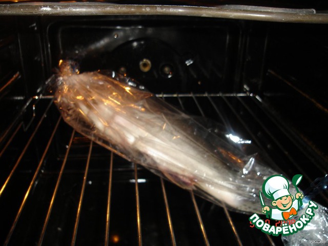 • Рыбу помещаем в рукав, полотно накалываем в нескольких местах (делаем проколы для выхода пара).