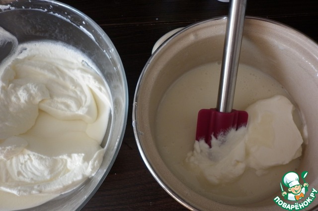 Холодные сливки взбить до устойчивых пиков (осторожно, не перестарайтесь! Масло нам ни к чему).